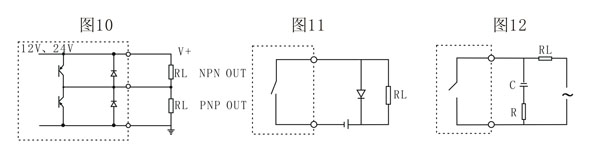 在直流方式使時(shí),對于感性負(fù)載,應(yīng)如圖10虛線所示加接續(xù)流二檢管,續(xù)流二級管選用0.5 A,三倍以上負(fù)載電壓。