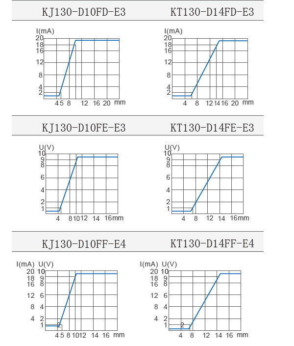 2.各種模擬傳感器標準檢測體接近感應面,在規定的條件下,它們的可使用距離與輸出電流成比例,各曲線詳見備曲線圖。