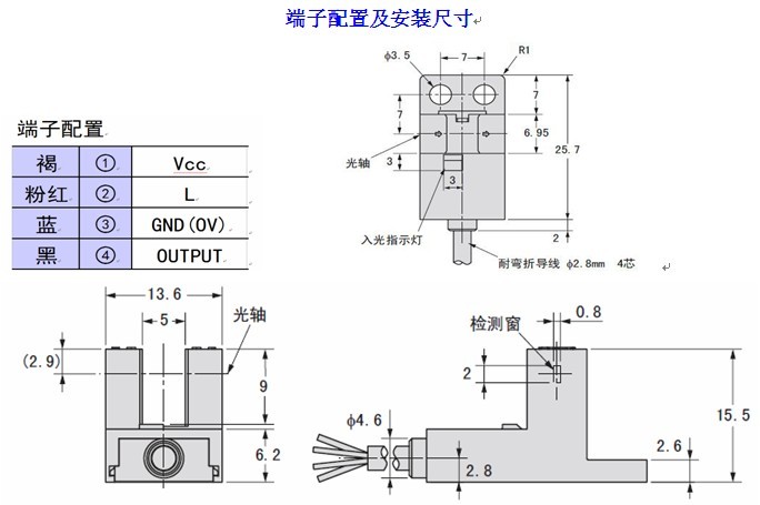 受光時紅色指示燈亮,NPN集電極無輸出;遮光時紅色指示燈滅,NPN集電極開路輸出DC5V--24V 、 100mA以下,殘留電壓0.5V以下(負荷電流100mA時)、殘留電壓0.3V以下(負荷電流40mA時)